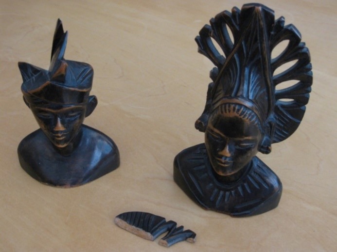 Voor mij op tafel staan twee houten beeldjes. Ze zijn door één van mijn ooms, die deelnam aan de politionele acties, meegenomen uit Indonesië. Hij gaf ze aan mijn ouders, nog voor ik was geboren. Ik ben ermee opgegroeid, ze stonden altijd op de schoorsteenmantel in de woonkamer.
