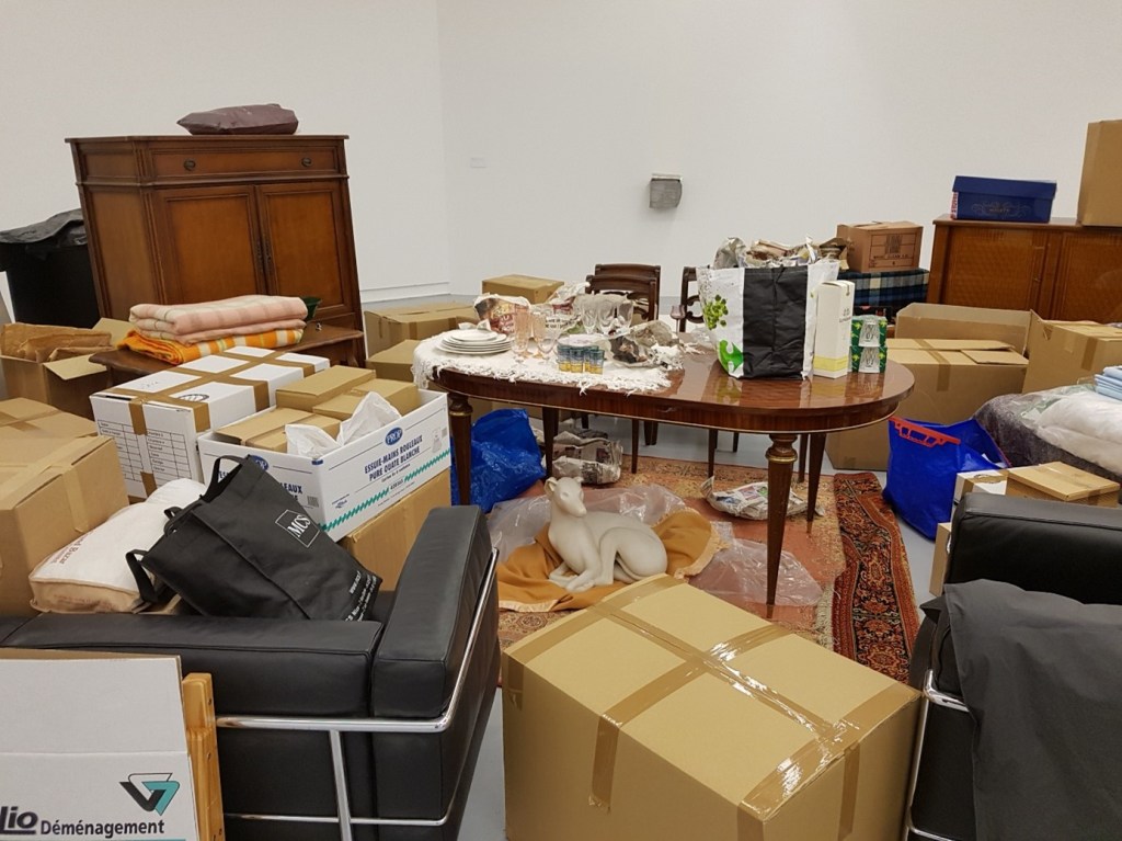 Zo exposeerde ze oude dekens, nog half in het plastic van de stomerij, met zorgvuldig gestopte gaatjes en niet helemaal uitgewiste vlekken. Het roept meteen het beeld op van een mogelijke eigenaar, een ouder iemand waarschijnlijk, die arm is of zuinig. Iemand die de oorlog nog heeft meegemaakt en niets weggooit wat nog van waarde kan zijn in een onbestendige toekomst. Een ander beeld dat me trof was een opstelling, bestaande uit een mooie glanzende ovalen eettafel, met daar omheen kartonnen dozen, een zwartleren bankstel en twee houten kasten. Op de tafel staan twee roze kristallen glazen, nog half in vloeipapier, naast een stapeltje borden. Eronder ligt een Perzisch tapijt, dat al uitgerold is of nog opgerold moet worden. Een levensechte porseleinen hond, op zijn eigen oranje dekentje, kijkt vanonder de tafel vragend op. Andere voorwerpen zijn in dozen gestopt, onzichtbaar gemaakt. Het doet me denken aan mijn laatste verhuizing, toen ik mijn spullen bij elkaar op straat zag staan in afwachting van de verhuiswagen en voelde: ik heb op dit moment geen thuis. Ook dit is het beeld van een verhuizing, van het overgangsmoment tussen het oude en het nieuwe thuis en ook dit beeld roept een gevoel van ontheemding bij me op. Het zijn de dingen, zonder hun eigenaar, en zonder dat ze in een bepaalde orde ten opzichte van elkaar staan.