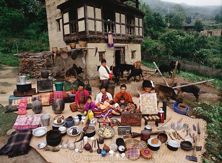 Op deze foto van een gezin in Bhutan zie je hoe duidelijk de verbinding is tussen de familie en hun dingen: kleuren, materialen, mensen, dieren en landschap, alles hoort bij elkaar. Hier zie je wat je nodig hebt en wat mooi en belangrijk kan zijn, als je op deze plek woont: kleurige matten en kussens, ijzeren waterkannen, geiten, een religieuze afbeelding. Met al hun eigendommen voor zich uitgespreid is zowel het totale bezit van deze mensen zichtbaar, als de demontage van hun dagelijkse omgeving.