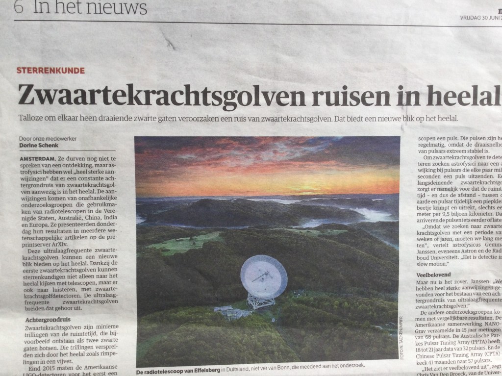 Graag lees ik artikelen over sterrenkunde. Ik snap er niets van. Maar ik geniet van de taal. Want ook al ik begrijp ik het niet, de woorden roepen wel beelden op. Zwaartekrachtgolven ruisen in heelal zegt deze kop in het NRC van 30 juni j.l. Dat is toch een heerlijke zin? Ik zie golven door een inktzwarte duisternis stromen, ook al is er geen lucht. En zwarte gaten die alle materie om zich heen opslokken, maar niet elkaar. Zij dansen in een stabiel ritme om elkaar heen. Als vuurwerkballen. Maar dan stil, donker en ongezien.
