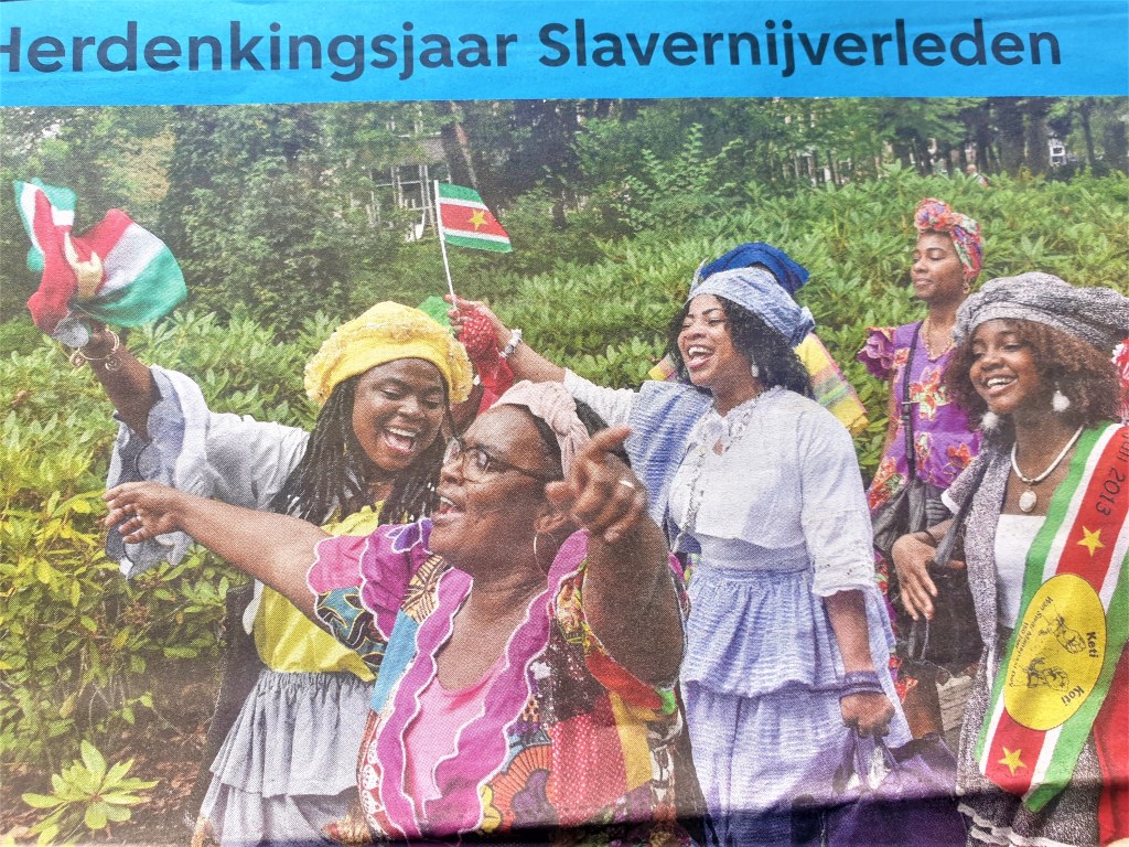 Een jaar of tien, vijftien geleden, werkte ik op het stadhuis in Amsterdam. Onze kamer had uitzicht op de Blauwbrug en op een ochtend klonk er vrolijke muziek buiten, getrommel, zang. Toen ik uit het raam keek zag ik een groep mensen staan: vrouwen in traditionele Surinaamse gewaden, kunstig gevouwen doeken op het hoofd, een man met een trommel. Nieuwsgierig liet ik mijn werk in de steek en ging naar beneden. Het bleek te gaan om KetiKoti , de viering van de bevrijding van de slavernij. Een groep van zo’n vijftig, misschien honderd mensen zette zich in beweging naar het Oosterpark voor een herdenking. Ik had er nooit eerder iets over gehoord.